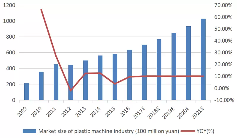 Mamlakatimning plastik mashinasozlik sanoati allaqachon katta hajmga ega. Ayni paytda mamlakatimizning asosiy plastmassa mashinalari ishlab chiqarish quvvati 100 ming komplektdan oshdi, jumladan, 8 mingdan ortiq ekstruziya uskunalari, 30 mingdan ortiq inyeksion kalıplama mashinalari, 3000 dan ortiq ichi bo'sh kalıplama uskunalari va 3000 dan ortiq plastmassa mashinalari. Yillik ishlab chiqarish qiymati 8 milliarddan 10 milliard yuanga etadi.